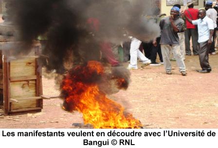 Les cours ont été perturbés ce vendredi 22 Juillet à l’Université de Bangui. Des étudiants en 3ème année de la faculté des lettres exigent la révision des anciens textes règlementant leurs accès en année de maitrise. Depuis hier, ils ont pris d’assaut les locaux et empêché le Doyen de leur faculté d’avoir accès à son bureau. Ces étudiants en colère ont produit un concert de casserole, brulé des pneus et menacé de barricader l’avenue des Martyrs, constate le reporter de Radio Ndeke Luka.