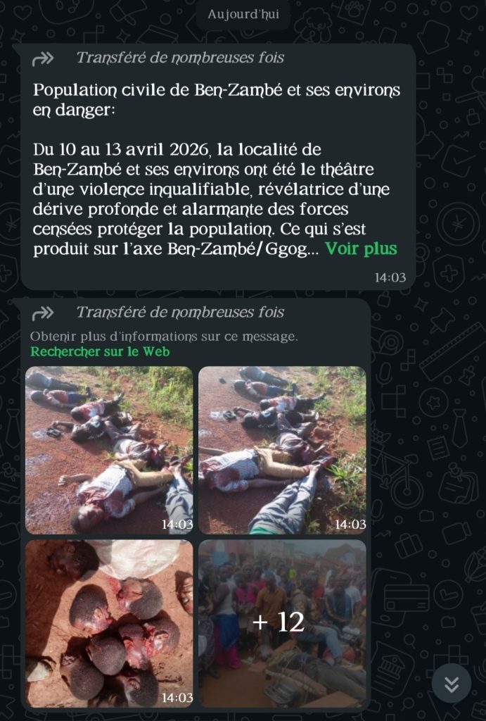 Dans la matinée du 14 avril, des images atroces ont circulé dans des groupes WhatsApp, montrant des corps sans vie et décapités. Selon le texte qui accompagne ces images, les faits se seraient produits sur l’axe Ben-zambé/Gbogozi à environ 12 km de la ville de Bossangoa dans le Nord de la République centrafricaine. Selon l’auteur de la publication, il s’agit d’une opération conjointe des forces armées centrafricaine et leurs alliés russes qui aurait conduit à ces tueries.